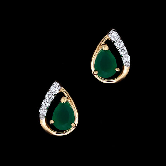 Gracefully elegant, the Emerald Raindrop Stud Earrings feature a pear-shaped green gemstone nestled within a teardrop frame of warm yellow gold. A sparkling row of round-cut diamonds curves along the top edge, enhancing the vivid green hue and adding a touch of brilliance. Perfect for both daywear and evening glamour,...